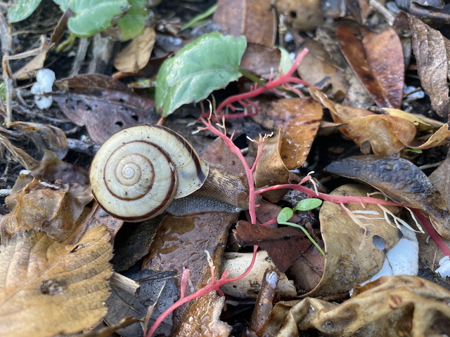 シモダマイマイ(北の山)。大島では珍しい殻色のパターンをしている。