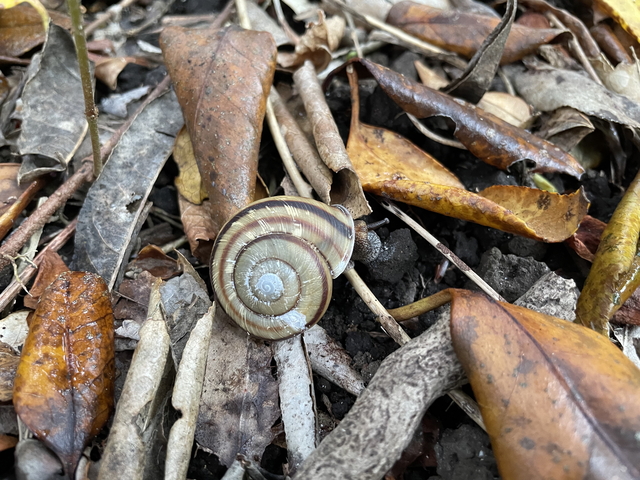 シモダマイマイ(岡田地区で撮影)。大島でよく目にするクリーム色の殻色に、色帯と呼ばれる黒い帯が見られるパターンの個体。