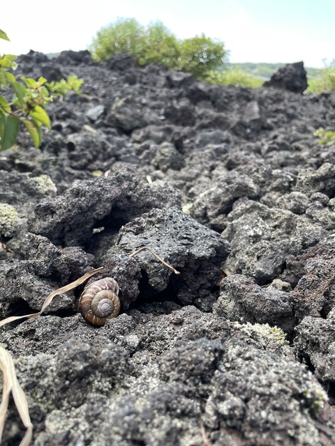 シモダマイマイ(1986年A溶岩流で撮影)。真夏の溶岩流上でも目にする。溶岩流上では暗色の個体が多い。