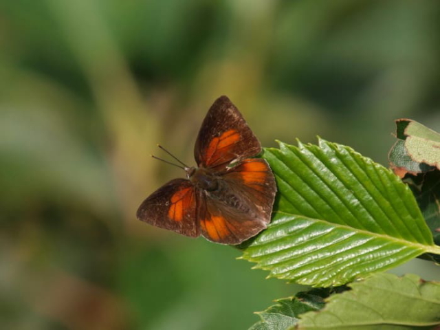 翅を閉じてとまっている姿が銀色なのでこの名が付いた。オスとメスで表翅の色が違う。飛んでいると銀色の翅がチカチカして知っていいればすぐに判る。