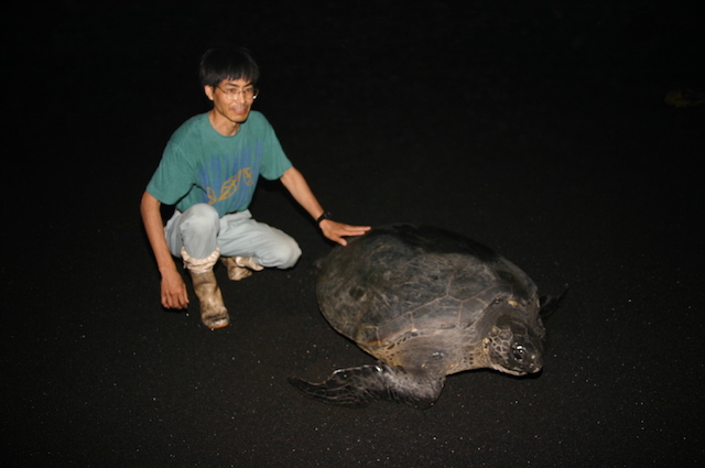 初確認になった産卵を終えて帰海する親ガメとの記念撮影。背甲の美しい深緑色が印象的だった。甲長1m3cm。2004年6月29日未明。読売新聞大島通信部金森靖明記者撮影・提供。