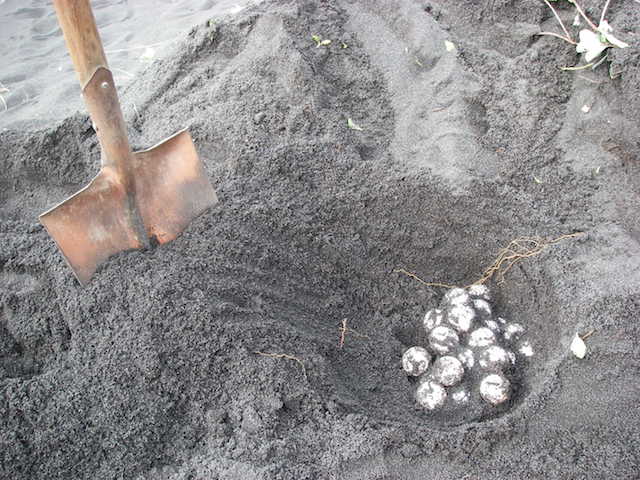 アオウミガメの産卵巣。卵塊。110個前後を1度に産み落とす。150個を超えることもある。オキナガレガニなどウミガメの付着生物が巣内に残されていることもある。