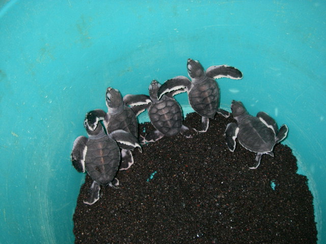 バケツの中の孵化幼体(孵ったばかりの子ガメ)。特別な許可を得て人工孵化をした際の子ガメたち。9月中旬の産卵だったが、海水温が低くなる前に放すことが出来た。子ガメは通常、夜間に砂の中から脱出すると、かすかに明るく見える海の方角へ砂浜を這いながら、その方向を地磁気で獲得するので、砂浜を這う経験は大切である。次に海へ入ると磁気コンパスに切り替えて獲得した方向を定位し続け外洋へ向かう。バタバタと泳ぎ続ける動き(フレンジー)を1日ほど続け、後は海流に身を任せて陸地から離れ、流れ藻などと共に大海を旅して成長する