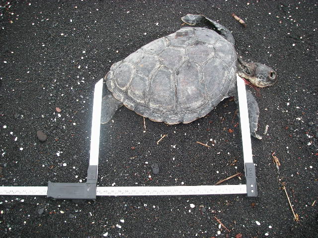 漂着体は死んでいる場合がほとんどで、四肢や頭部のない個体も多い。発見したら、種、性別、サイズ、外傷、付着生物、腫瘍の有無、標識(タグ)の有無などを調べ、写真撮影する。甲長・甲幅は特大ノギスで直線での長さをミリ単位で測る(直甲長・直甲幅)。メジャー巻尺で背甲の曲線を測った場合は、「曲甲長・曲甲幅」と明記する。
