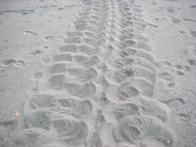 親ガメが上陸して平らな砂浜を這った跡(上陸跡・上陸痕跡)。ウミガメ科で体が最も大きくなるアオウミガメは、上陸跡の幅が1m20cmを超えるものもある。種によって上陸跡は異なり、個体によっても微妙な差がある。