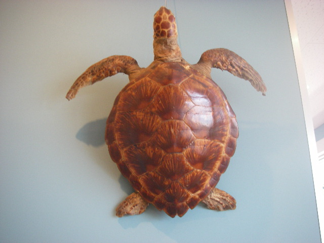 甲長が約38cmの子ガメの剥製。別名の「アサヒガメ」は、このように幼体・亜成体の背甲鱗板にある朝日が昇るような放射状の模様から呼ばれる。